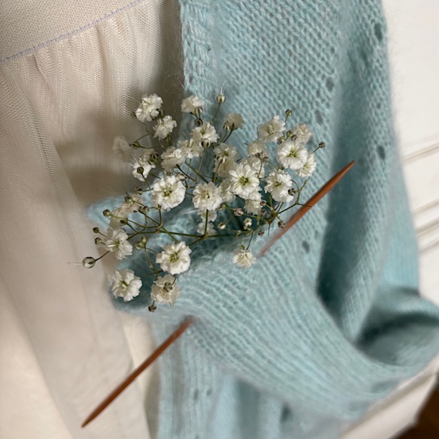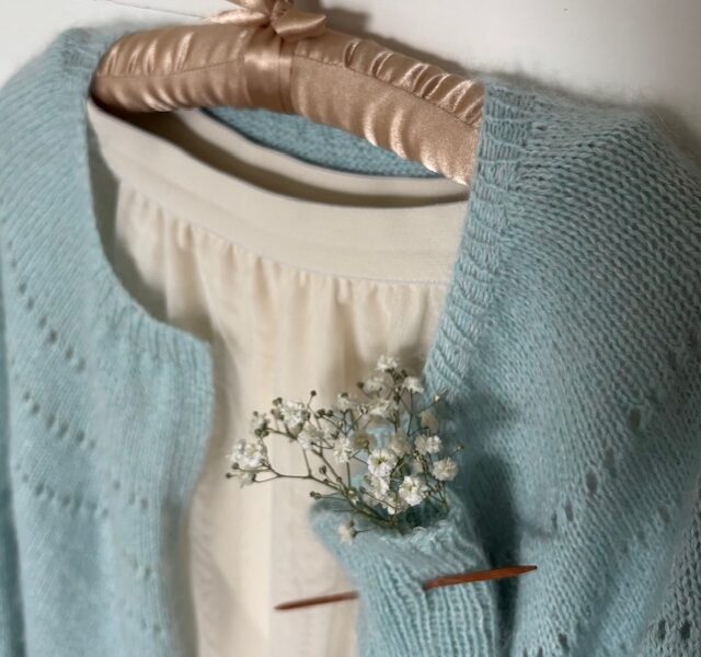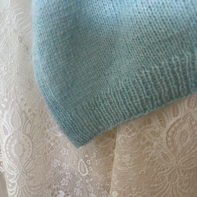 Lankana neuletakissa on huippuriittoisa Holst Garnin Coast (55 % merinovilla, 45 % puuvilla, 350 m/50 g, light fingering) sävyssä ‘spearmint’ sekä Tynn Silk Mohairin (57 % mohair, 15 % villa, 28 % silkki, 212 m/25 g, lace) sävy ‘Arctic ice’. Neuloin siis em. langat yhdessä, molemmat yksinkertaisina. Näin tuli kevyesti pörröinen, miellyttävä ja kutittamaton vaate!