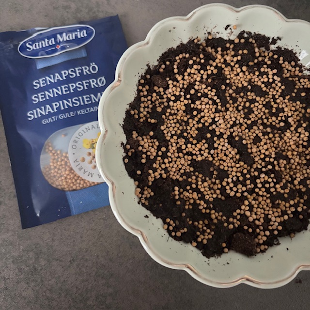 Ja koska aina tarvitsee myös onnistumisen kokemuksia mahdollisten pettymysten vastapainoksi, istutin ruokapöytää koristamaan takuuvarmoja sinapinsiemeniä. Siitä voi napsia sitten leivän päällekin pientä potkua, kun kasvavat iduiksi.