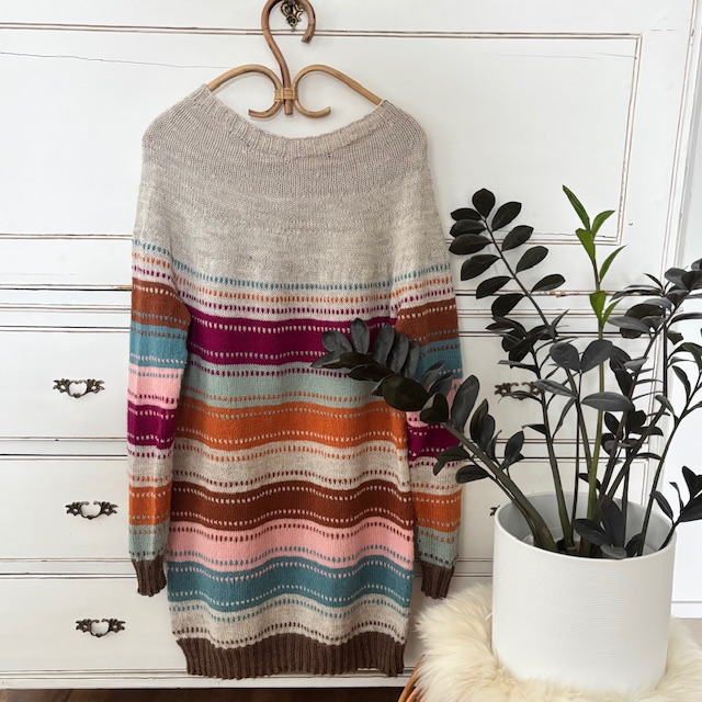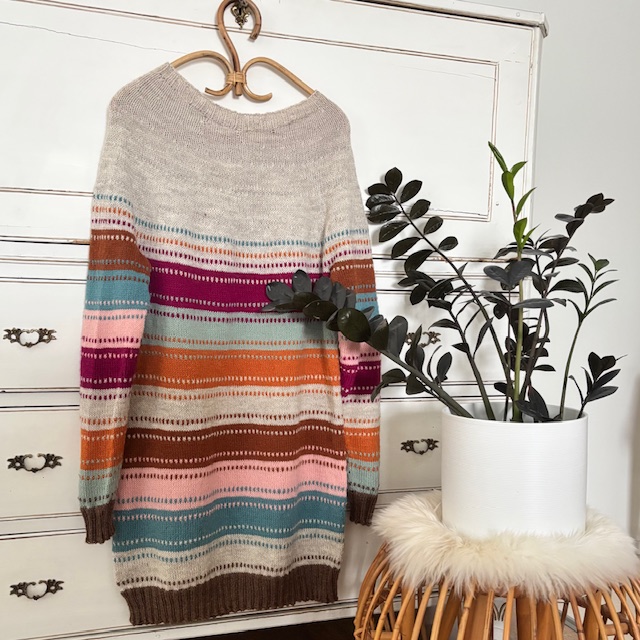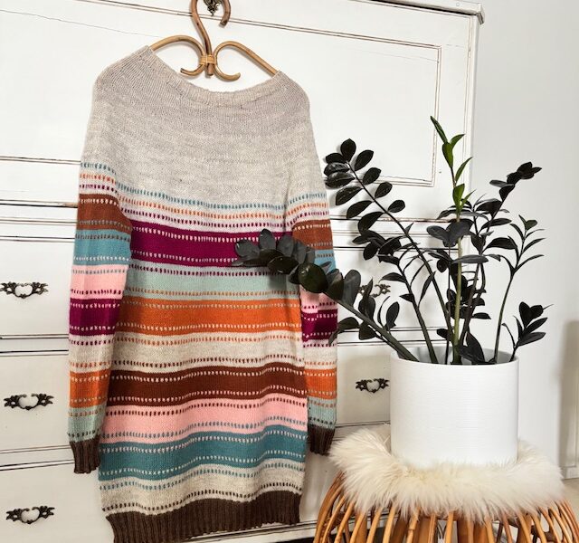 Paidasta vielä sen verran, että se on neulottu alhaalta ylös, yhdistäen hihat ja vartalo-osa yhdeksi kappaleeksi ennen kaarroketta. Vartalo-osaan tässä noin L-koon puserossa loin 256 silmukkaa. Hihojen resoriin loin 40 s ja lisäsin 2 silmukkaa joka 6. kerros niin usein, että hiha oli itselleni sopivan pitkä. Tällöin hihassa oli lopulta 86 silmukkaa. Kainaloa varten varasin 16 silmukkaa. Hihojen ja vartalon yhdistämisen jälkeen pitkällä 3,5 mm pyöröpuikolla oli 364 silmukkaa, joita kavensin ensin harvemmin kerrosvälein, lopulta tiuhempaan mallaillen yläosaa matkan varrella itselleni sopivaksi. Tällaiseen “vapaaneulontaan” kannustan ihan kaikkia! <3