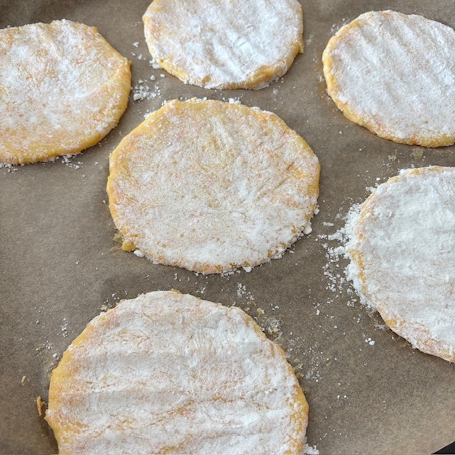 - Nosta lusikalla leivinpaperilla vuoratulle pellille taikinanokareita ja taputtele niistä jauhon avulla matalia rieskasia.