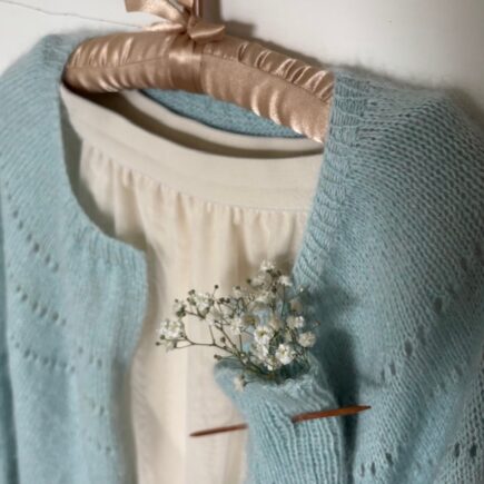 Kylläpä olenkin innostunut neulomaan varastolangoista! Nyt syntyi Dropsin Brushed Alpaca Silkistä paita, jonka helmaan ja hihansuihin tein saman pitsineulekuvion kuin muutama viikko sitten valmistuneeseen huiviin. Vaaleansinistä lankaa oli jäljellä vain kaksi kerää, mutta siskoni lahjoitti jo tovi sitten vastaavaa vihreää – ja sävyt sopivat yllättävän hyvin yhteen! Neuloin paidan alhaalta …